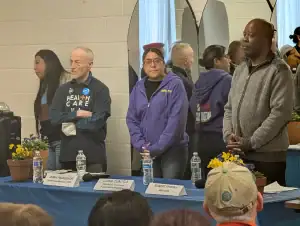 Together, attendees chanted “Hands off! Hands off!” – a rallying cry referring to Malliotakis’ – and the national Republican party’s – proposed cuts to Medicaid, Medicare, Social Security, CHIP, WIC, and more. As the shouts died down, DeCillis got the event rolling. He opened with a thank-you to the group for showing up and a brief introduction, then gave the room some history on how the town hall came to be: