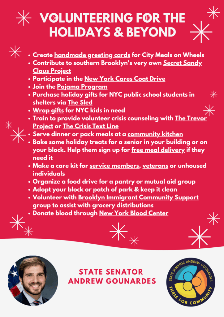 Our State Senator also provided an excellent list of ways you can help volunteer your time this holiday season…