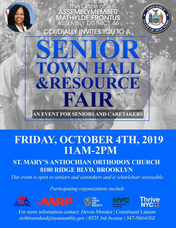 Seniors and caretakers are welcome at this town hall and resource fair in the heart of Bay Ridge, sponsored by Assemblymember Mathylde Frontus.
